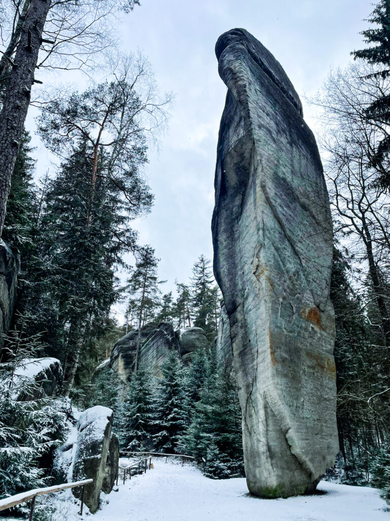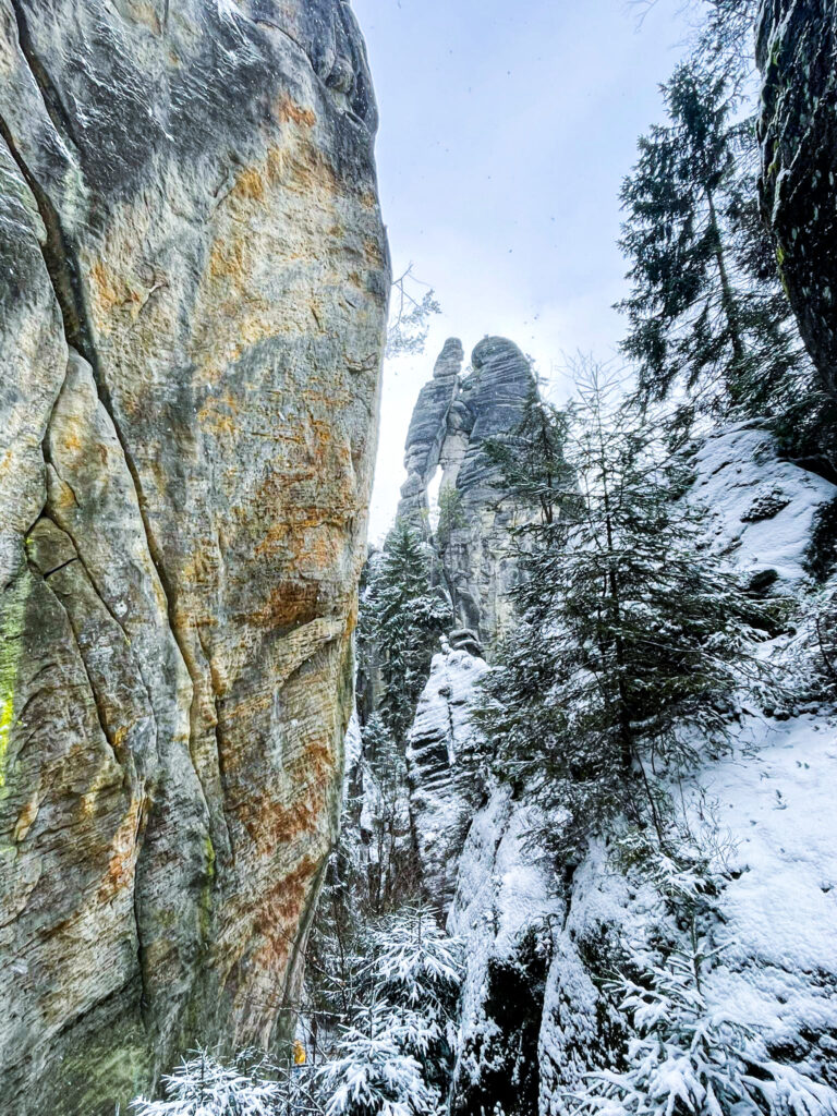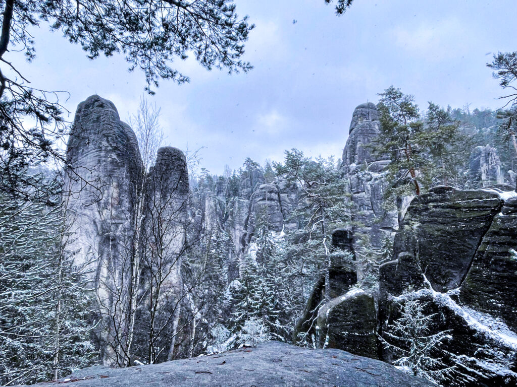 Naše trasa měla asi 12 km. Když jsme vyšli, hustě sněžilo a foukalo, ale poté co to ustálo, tak zasněžené Adršpašské skály vypadaly opravdu jak v zimní pohádce. Taky že se zde pár pohádek skutečně natáčelo. Uhodnete jaké? Jediná nevýhoda tohoto počasí byla, že to opravdu velmi klouzalo. V teniskách tedy rozhodně v zimním období návštěvu Adršpachu nedoporučuji, ale stejně jsme na pár takových lidí narazili.